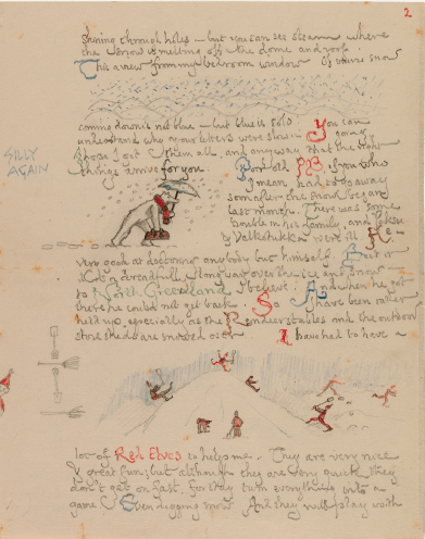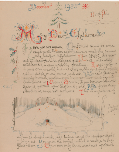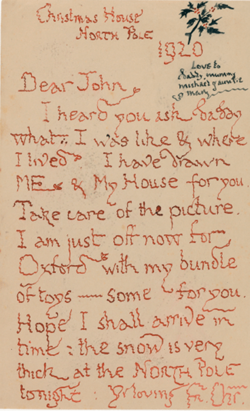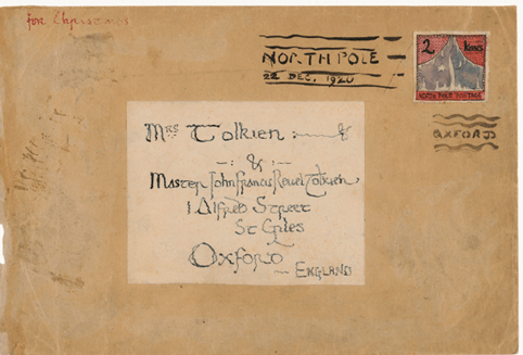 Uma das obras mais graciosas de Tolkien é o livro Cartas do Papai Noel, um compilado de correspondências que o próprio autor escreveu para os seus filhos entre os anos de 1920 a 1943, na persona do Papai Noel. A primeira cartinha, de 1920, foi escrita ao pequeno John Francis, seu primogênito, que tinha então 3 aninhos. Ela vinha com um envelope personalizado, em um selo com o desenho do Polo Norte escrito “2 beijos” e “postagem do Polo Norte” destinados à Sra. Tolkien e ao Mestre John Francis Reuel Tolkien, com o endereço onde eles de fato moravam.