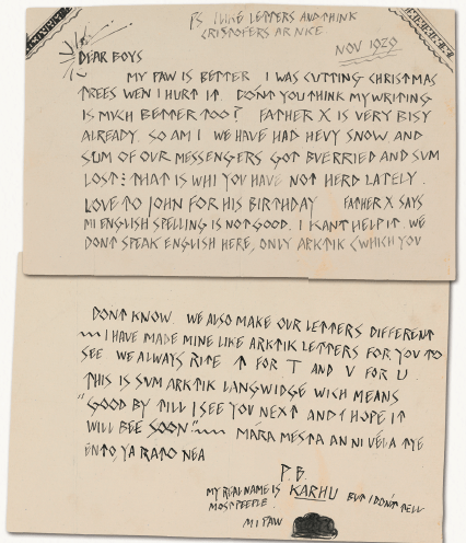 Karhu, como ele se chama de verdade, também tem muitas falhas na gramática e ortografia — que ainda não apareciam nas primeiras cartas. Segundo ele, sua língua original é o “ártico”, que possui até mesmo um sistema de escrita diferenciado — mas vale dizer que não foi lá muito desenvolvido. O curioso é que o ártico do nosso Urso Polar é a mesma língua quenya criada por Tolkien, falada pelos altos elfos.