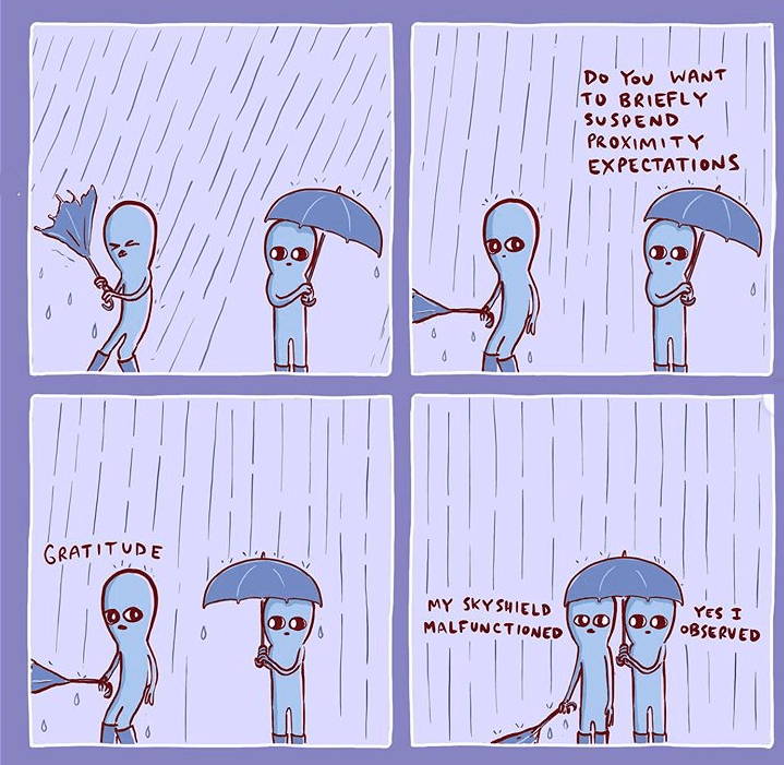 Há também quem use os compostos descritivos para fazer humor de bastante qualidade. É o caso de Nathan Pyle, por exemplo, com seu perfil de tirinhas no Instagram chamado Strange Planet. Seus alienígenas azuis passam por situações curiosamente semelhantes ao nosso cotidiano, mostrando as pílulas de pequenos absurdos que nós humanos engolimos dia após dia sem nos darmos conta. Com seu engraçado inglês altissonante, os ETs usam palavras compostas para coisas muito comuns. Assim, uma máquina automática de vender comida vira um ‘gravity-induced sustenance releaser’; um ursinho de pelúcia é uma ‘fabric predator creature’, ao passo que um simples guarda-chuva se torna um refinado ‘skyshield’. Quem imaginaria que algo semelhante a kennings e meio-kennings estaria em voga no falar cotidiano desse planeta estranho!