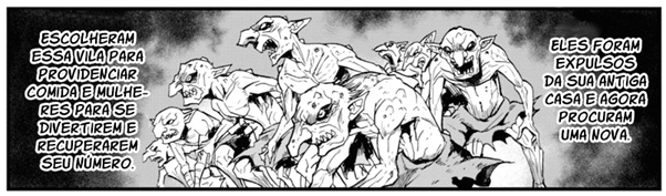 Trecho do vigésimo capítulo do mangá Goblin Slayer. A ordem de leitura é da direita para a esquerda, de cima para baixo.