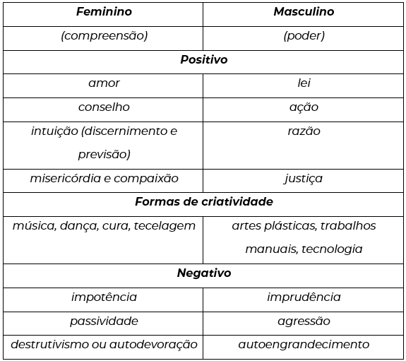 Isso não significa que os caracteres masculinos têm apenas princípios varonis, e os femininos não tenham traços viris em suas personalidades, do contrário, não seriam seres pessoais, mas tipos. Em uma linguagem literária, conforme Foster, seriam personagens planas e não esféricas. O que existe é uma preponderância de um ser masculino e de um ser feminino, em suas complexidades.