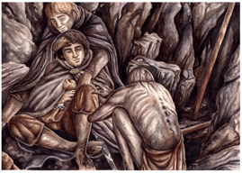 Frodo já não consegue mais responder por si mesmo, depende quase que totalmente do amigo. E é nesse ponto que o mestre Frodo dá lugar ao mestre Sam. Afirma John Garth em seu website: