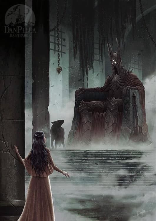 Então Lúthien se postou sobre a ponte, e declarou seu poder: e soltou-se o feitiço que juntava pedra a pedra, e os portões foram derrubados, e as muralhas, abertas, e as covas, desnudadas; e muitos servos e cativos vieram para fora em assombro e temor, protegendo os olhos da pálida luz da lua, pois tinham jazido longamente na escuridão de Sauron. (TOLKIEN, 2019, p. 240).