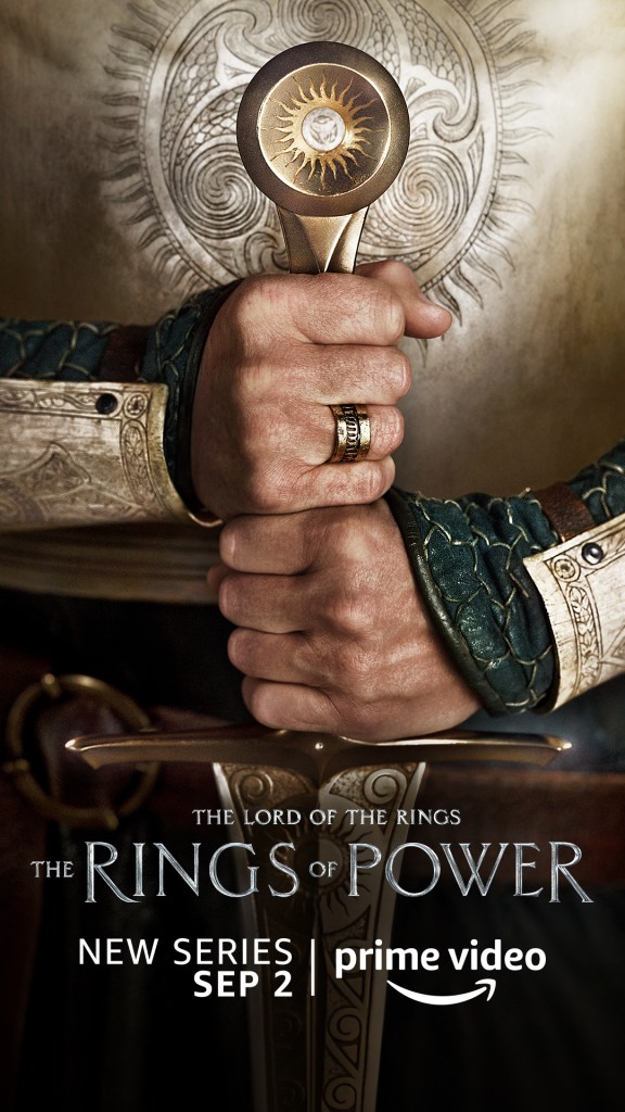 “Detalhe da mão de alguém. Não vemos o rosto da pessoa. Ela está segurando uma espada pelo punho voltada para baixo. A espada é ornamentada com um sol dourado no punho. A pessoa usa uma armadura dourada, com um emblema de sol parecido no peito.”